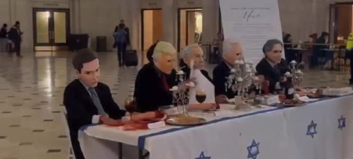Organized by anti-Israel activists (reports point to two key figures: Nerdeen Kiswani of Within Our Lifetime and possibly ties to Palestinian Youth Movement), this was billed as "Israel's Friendsgiving," a twisted Thanksgiving parody timed for the holiday week. Protesters set up a banquet table right in the station's main hall (a massive federal transport hub opposite the Capitol, where lawmakers and tourists swarm daily). They draped it with red-stained cloths, piled on prop body parts doused in fake blood, and role-played leaders chowing down while chanting about "genocide" and "organ harvesting" in Gaza.