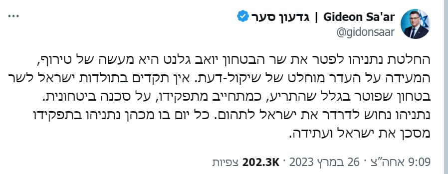Chairman of the National Religious Party, Knesset member Gideon Sa'ar, is expected to be appointed as Foreign Minister in place of Israel Katz, who was appointed as Minister of Defense instead of Yoav Galant, who was dismissed by Netanyahu. The move was coordinated with Gideon Sa'ar, who, as mentioned, will enter the government and be appointed a senior minister. Tonight, it is particularly interesting to recall what Saar thought about Galant's dismissal, which was cancelled following significant protests.